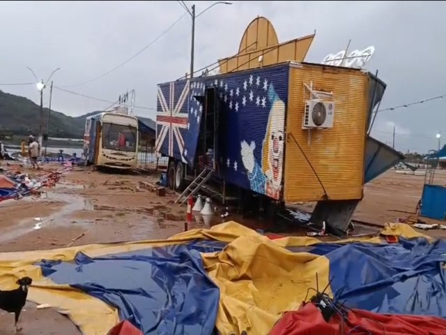 Nas margens do rio Xingu, a estrutura de um circo foi arrastada pela ventania. Outras tendas instaladas no local também foram atingidas pelo vento.